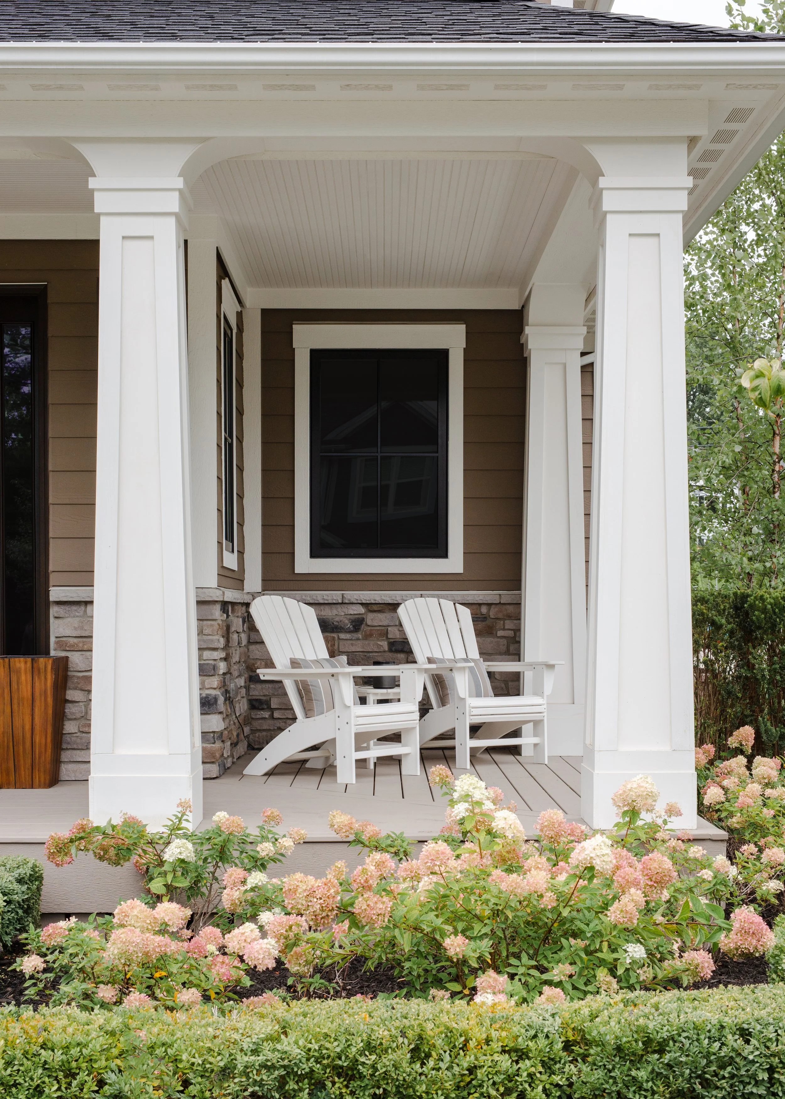 Our clients fell in love with the laid-back culture of downtown Rochester and the endearing charm of its neighborhoods, and wanted their ideal home to seamlessly blend with those local precedents. The variety of styles and unique characteristics of each home in its vicinity near downtown provided inspiration and an opportunity to create a unique story for itself. With a special emphasis on its front porch and entry, the home pays homage to the character and neighborly spirit of the downtown lifestyle that initially drew our clients to this property on its corner lot. A staple feature of downtown Rochester living, the wraparound porch serves as a key component that delivers maximum architectural interest. The porch helps to connect the personality of both corner elevations with their varied roof and window focal points, thoughtfully designed with the context of a corner lot in mind. Slightly tapered porch columns with subtle radiused capital details provide understated character. Cultured stone accents add interest and texture, while framing the porch windows comfortably on the wall above. Primary neutral tones add subtlety and contrast with the dark windows and roof planes.