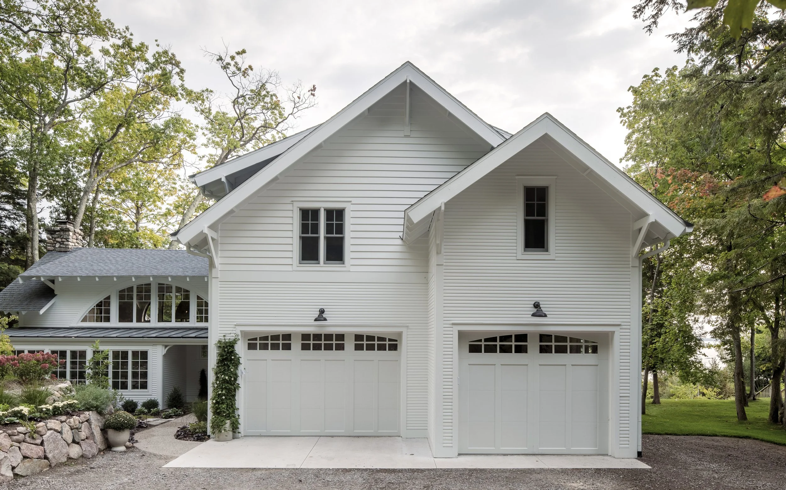 The detailing on the addition echoes the original cottage detailing – gable end roof overhangs, exposed rafter tails, divided lite windows, traditional trimwork, architectural brackets – blending old and new. The addition is designed to adopt the language presented by the cottage; the replication of existing detail was crucial to the project, and creates a home that feels unified and cohesive by design. Large multi-paned feature windows in nearly every room draw the eye towards views of the lake. Subtle textural and tonal variation in the interior decor add visual interest, without overpowering the experience of the landscape beyond. Picturesque private beach access and the nearby Tunnel of Trees only add to its romantic narrative as a family home meant to be remembered and cherished, and intended to be utilized inside and out throughout the year.