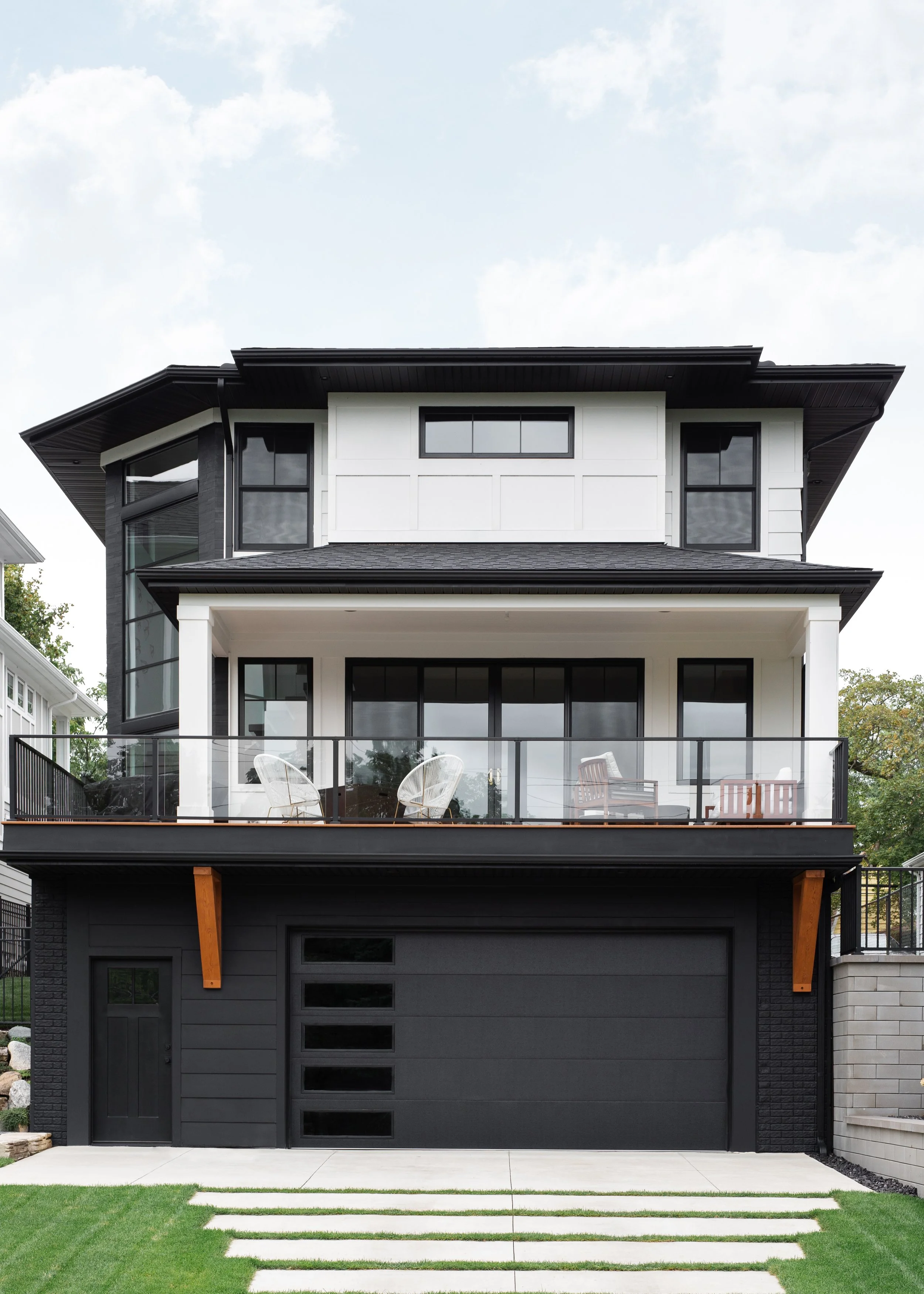 Balancing our client’s appreciation for their neighborhood’s vernacular and their love of bold styling, designing this home in downtown Rochester was an exciting challenge. The exterior proportions reference prairie style craftsman homes from the previous century with its large single hung windows and deep roof overhangs, while a striking black-and-white color scheme, varied applications of siding, and a sculptural double front door bring in modern design elements. A balance was struck with fitting in with the existing streetscape while pushing the home’s design boundaries; the home is designed to draw the eye and hold your attention.