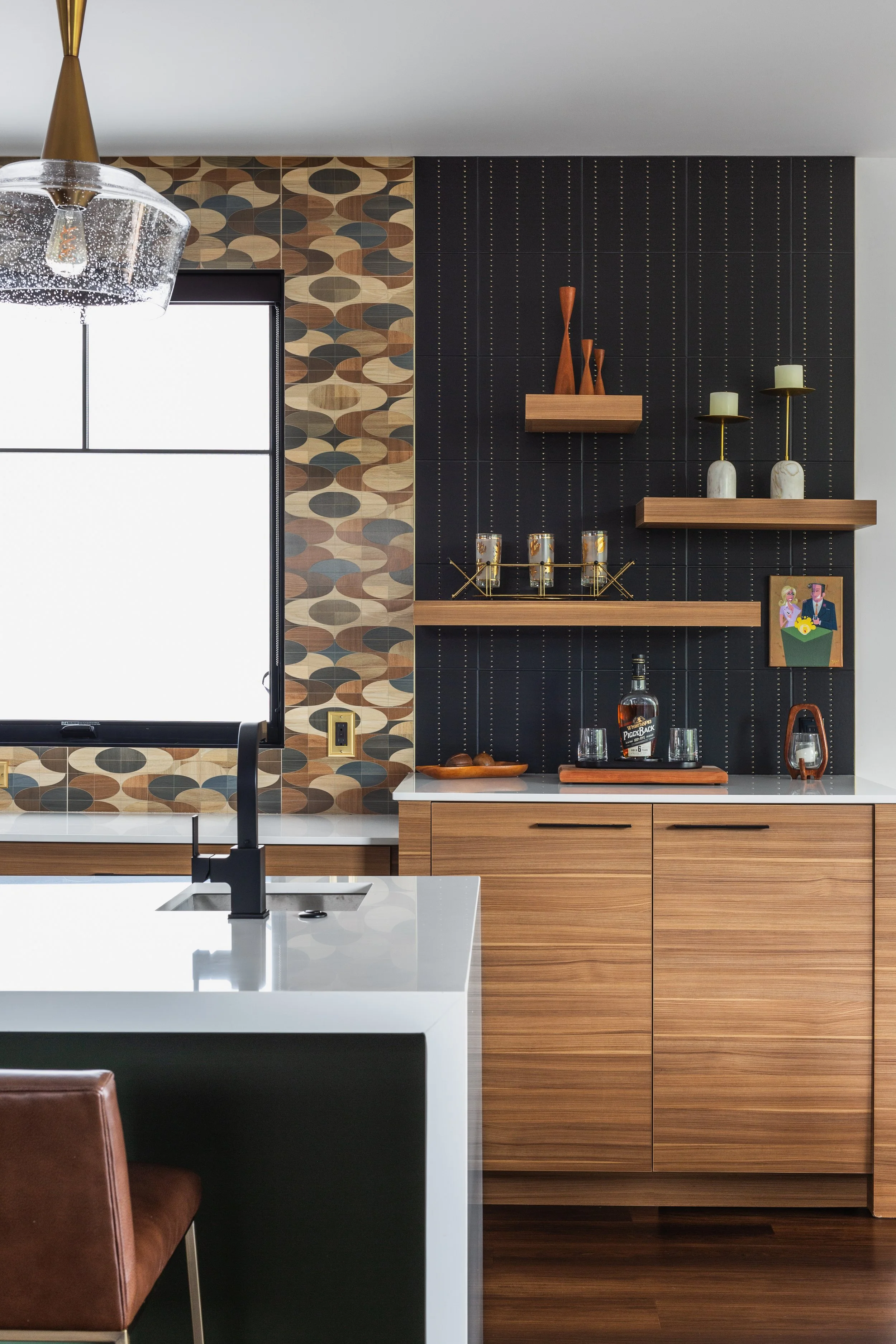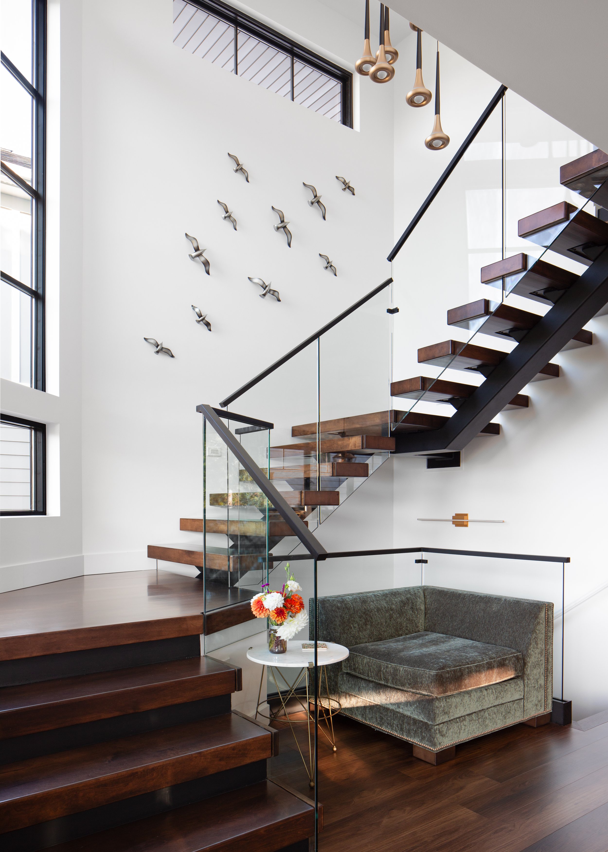 Inside, the emphasis on striking elements and pairing classic symmetry with modern detailing is evident throughout the home. Creating a main focal point in an open living space filled with zones of activity was addressed by an eye-catching fireplace design. Strong leading lines—black window frames, the nearby kitchen countertop, the cantilevered ledge that transitions from built-in bench to hearth—serve to guide the eye through the adjacent rooms and to the fireplace. The notably modern three-sided design creates a volume that cantilevers above the ledge below. Warm wood paneling on the chimney volume echoes the nearby kitchen cabinets, promoting connection between rooms of the home. Wall space under the transom windows provides opportunity to feature modern artwork that further enlivens the living area with color and expressive lines, playing off of the colors of the nearby upholstered furniture. The nearby feature stair serves as the defining move of the home’s design as a sculptural but functional architectural element that was visually accessible throughout the open living space of the home. Overlooking Rochester Municipal Park, a custom feature window allows natural light to permeate both main and upper levels, while the stairs’ mono stringer with floating treads and glass handrail allow the light to pass fully into the living spaces within. At night, the stairway becomes a sculptural display from the exterior when illuminated by the interior lights, showcased as a beautiful architectural element that is meant to be seen and remembered.